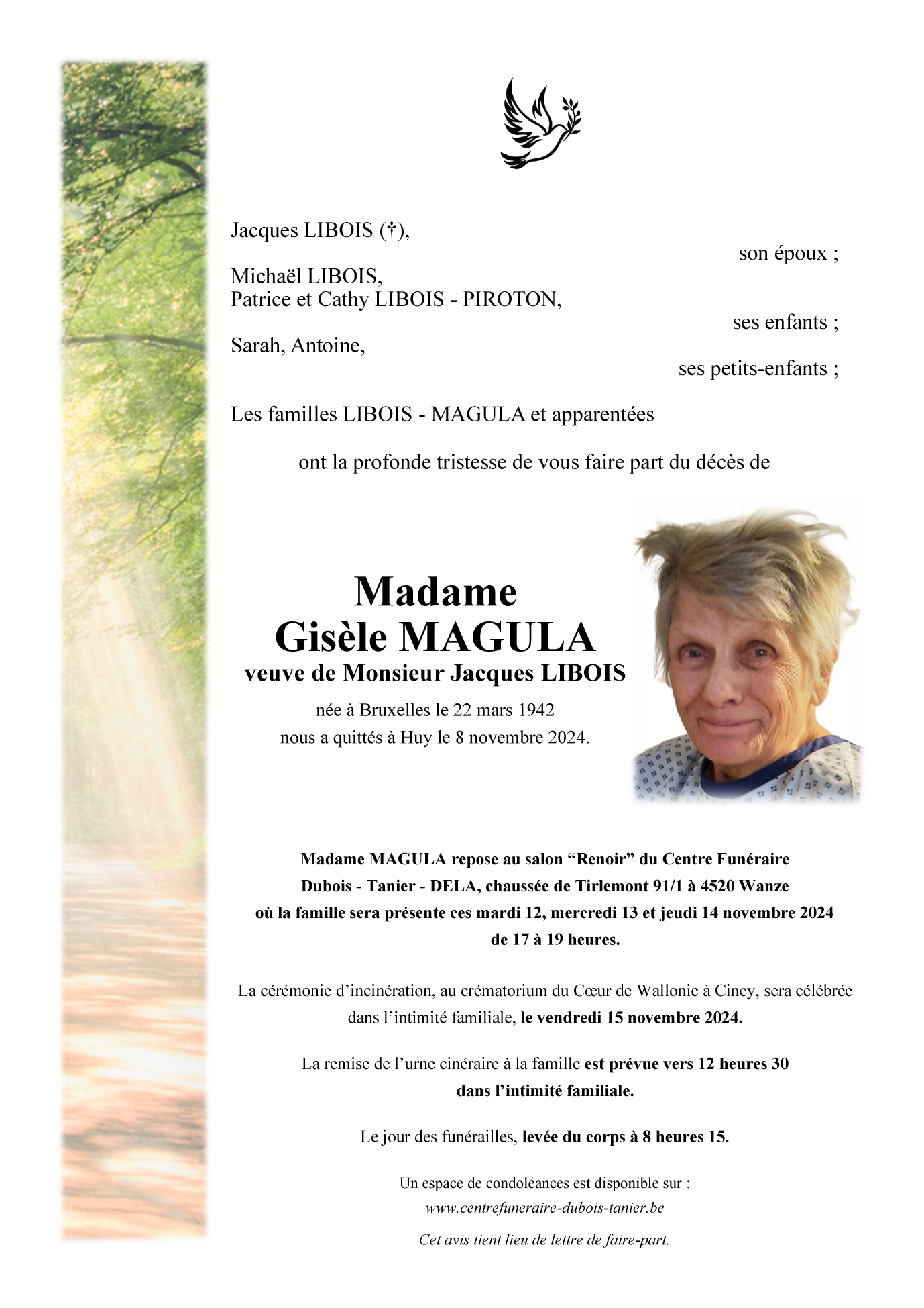 Décédée à Huy (4500) le vendredi 8 novembre 2024 à l'âge de 82 ans