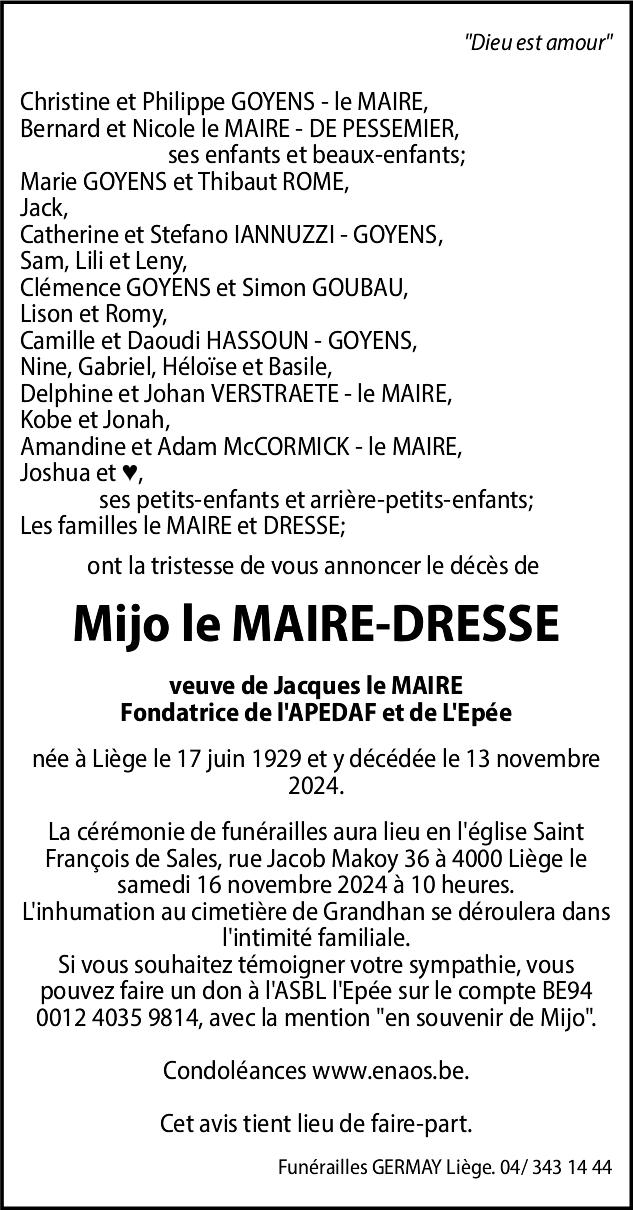 Décédée à Liège (4000) le mercredi 13 novembre 2024 à l'âge de 95 ans