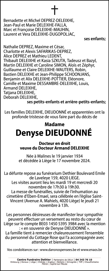 Décédée à Liège (4000) le dimanche 17 novembre 2024 à l'âge de 90 ans