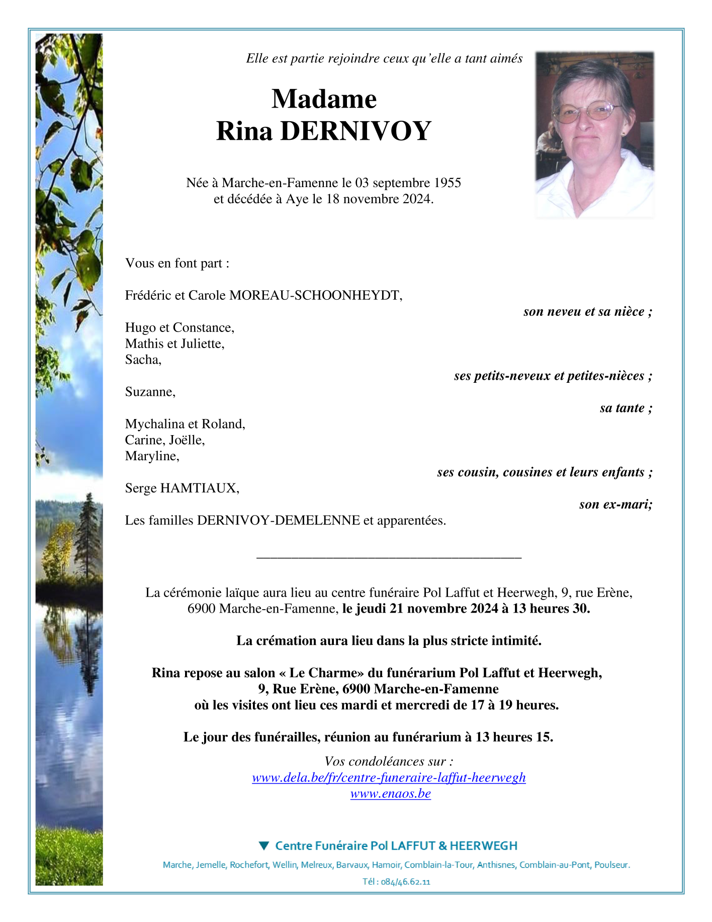 Décédée à Marche-en-Famenne (6900) le lundi 18 novembre 2024 à l'âge de 69 ans