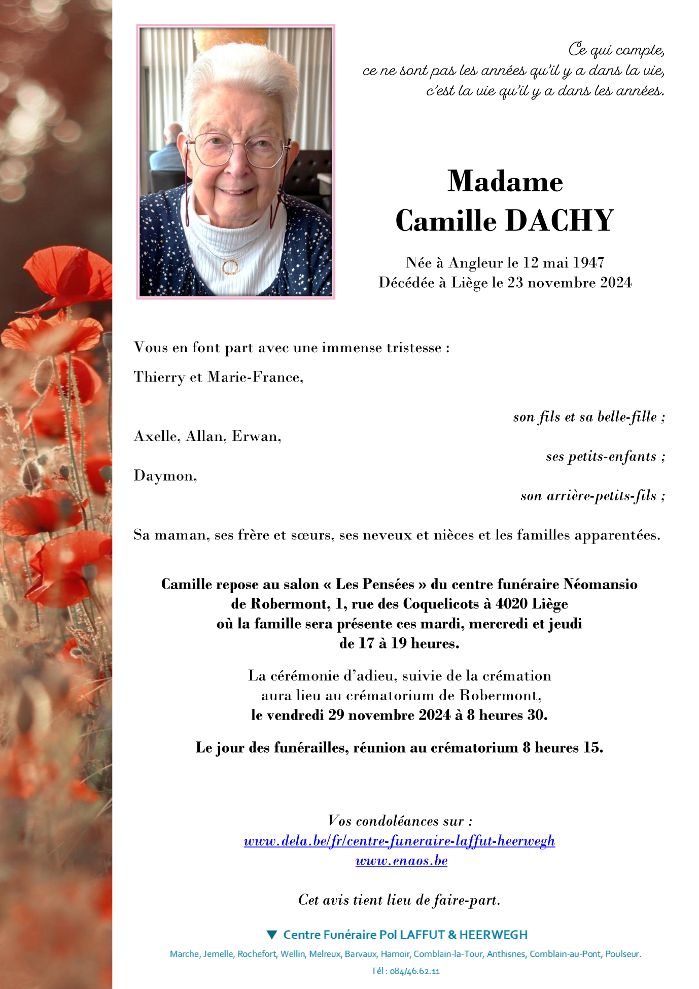 Décédée à Liège (4000) le samedi 23 novembre 2024 à l'âge de 77 ans
