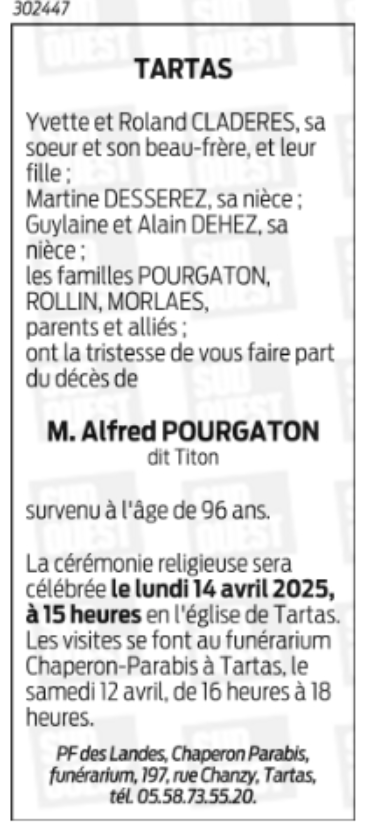 Décédé à Begaar (40400, France) le mercredi 9 avril 2025 à l'âge de 96 ans
