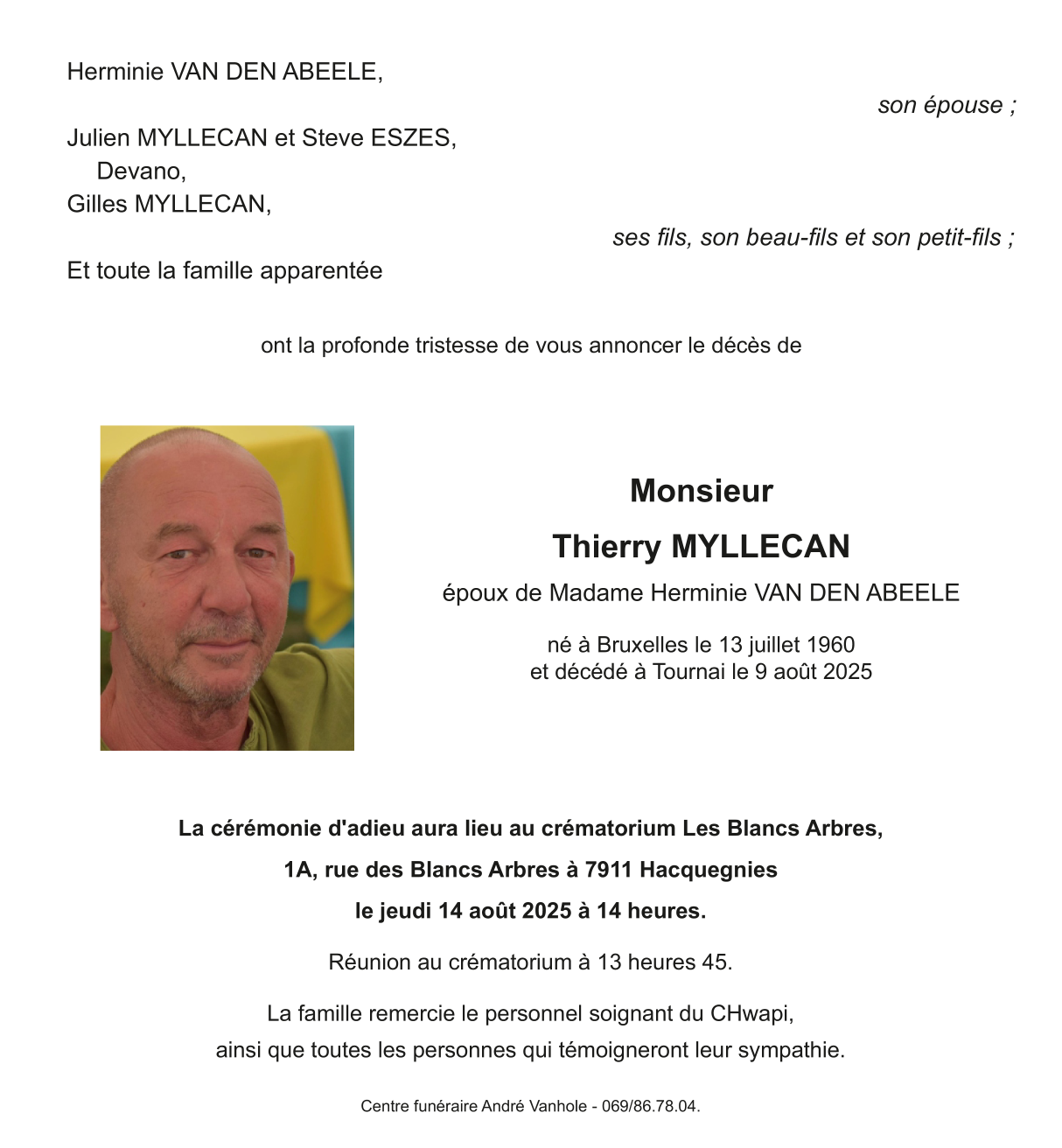 Décédé à Tournai (7500) le samedi 9 août 2025 à l'âge de 65 ans