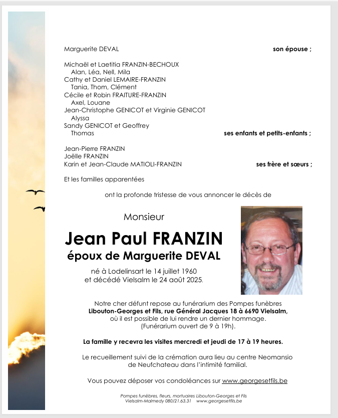Décédé à Vielsalm (6690) le dimanche 24 août 2025 à l'âge de 65 ans