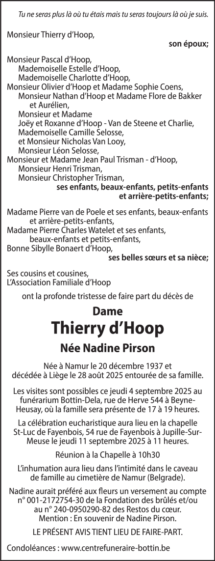 Décédée à Liège (4020) le jeudi 28 août 2025 à l'âge de 87 ans