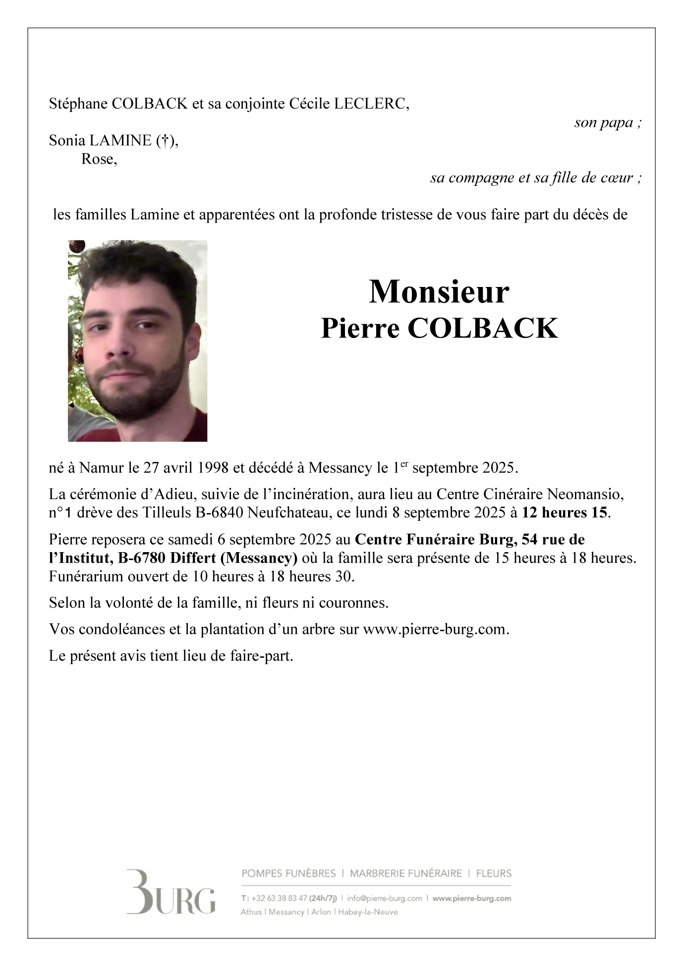 Décédé à Messancy (6780) le lundi 1 septembre 2025 à l'âge de 27 ans