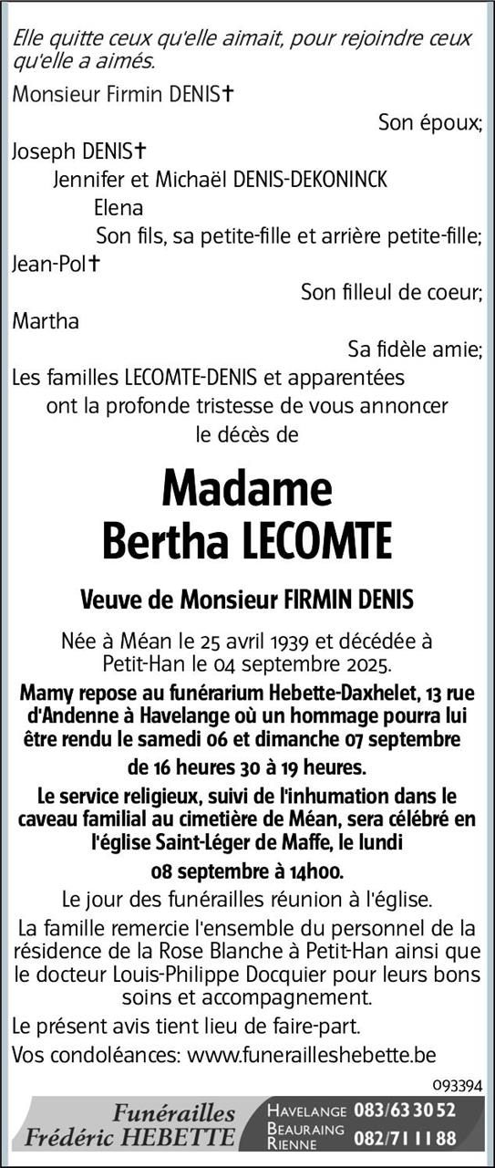 Décédée à Petit-Han (6940) le jeudi 4 septembre 2025 à l'âge de 86 ans