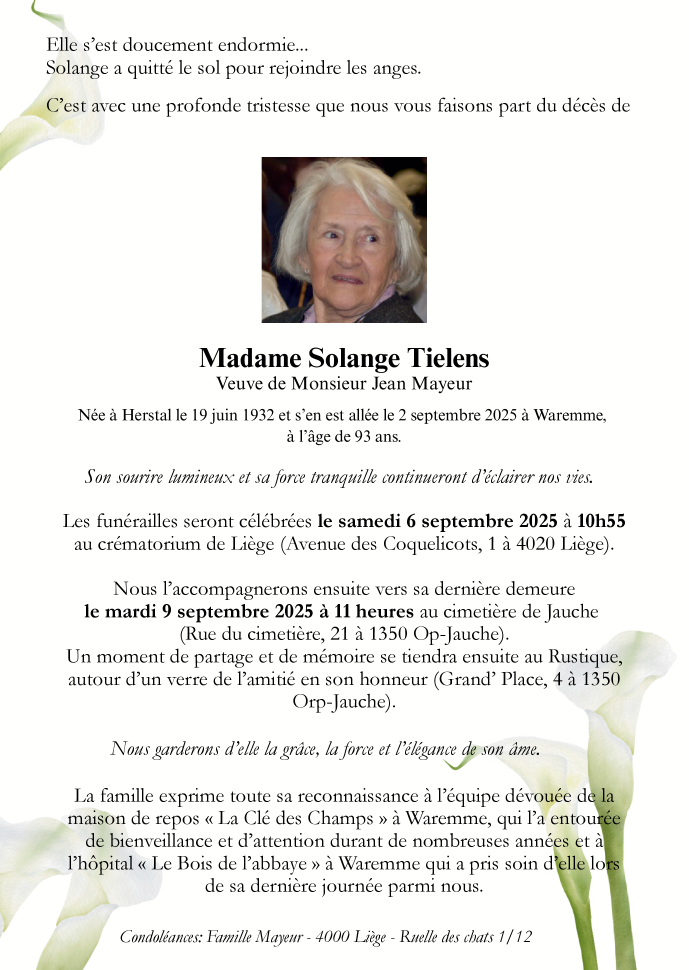 Décédée à Waremme (4300) le mardi 2 septembre 2025 à l'âge de 93 ans