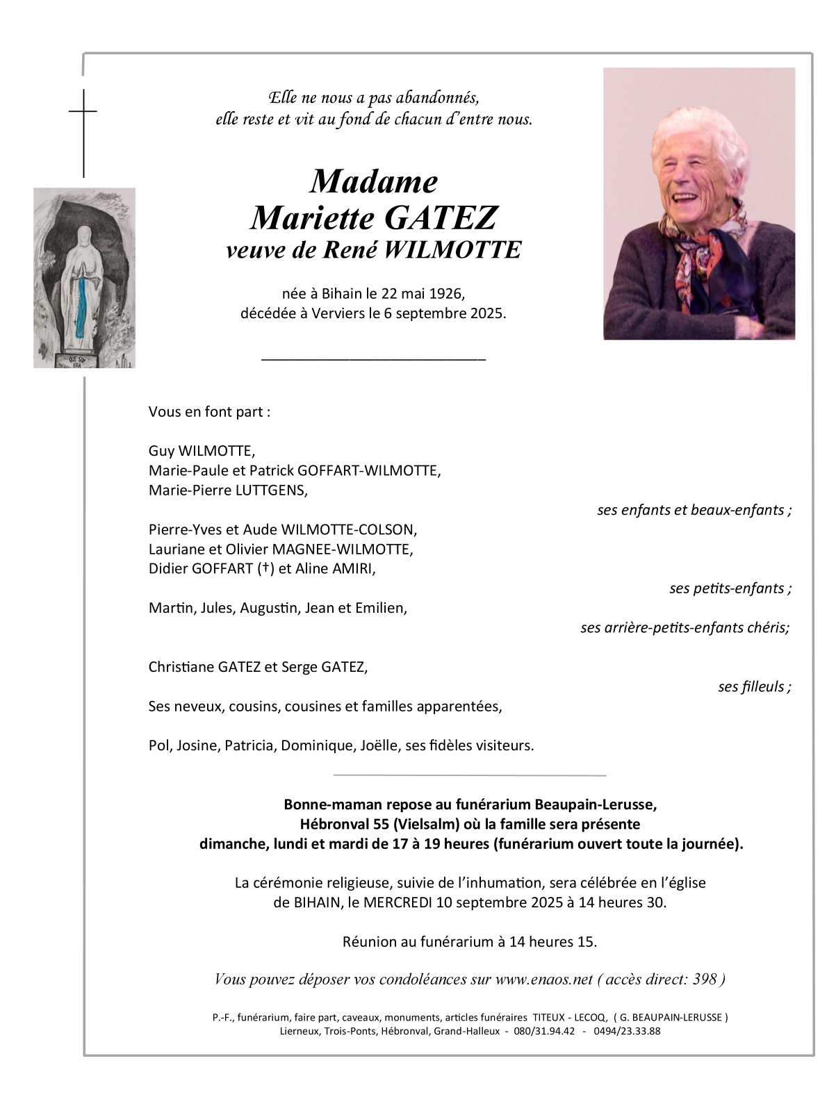 Décédé à Verviers (4800) le samedi 6 septembre 2025 à l'âge de 99 ans