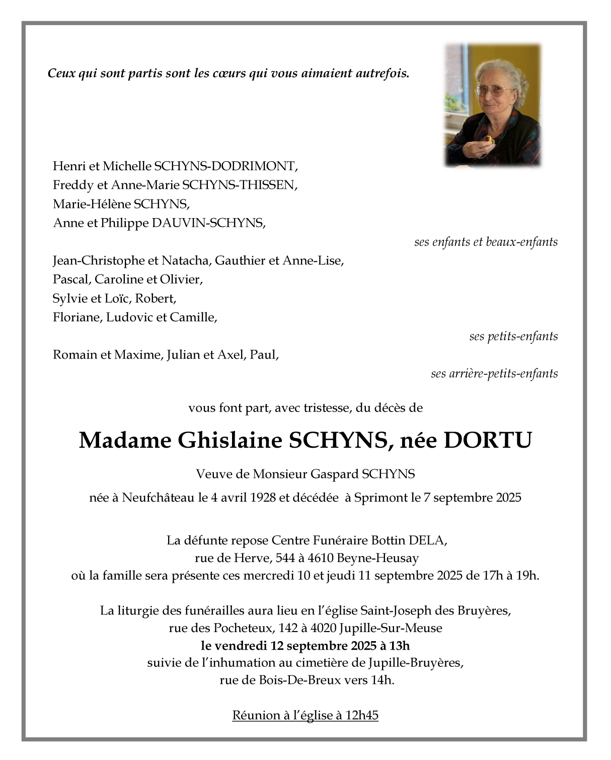 Décédée à Sprimont (4140) le dimanche 7 septembre 2025 à l'âge de 97 ans