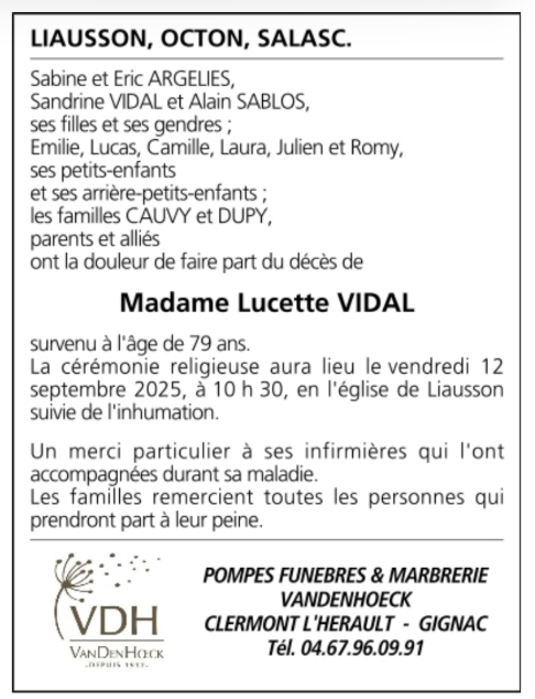 Décédée à Bédarieux (34600, France) le mercredi 10 septembre 2025 à l'âge de 79 ans