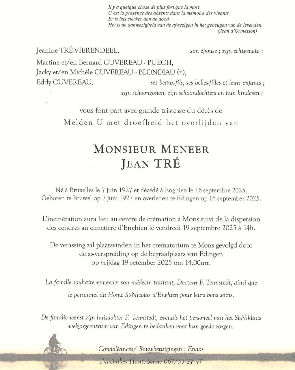 Décédé à Enghien (7850) le mardi 16 septembre 2025 à l'âge de 98 ans