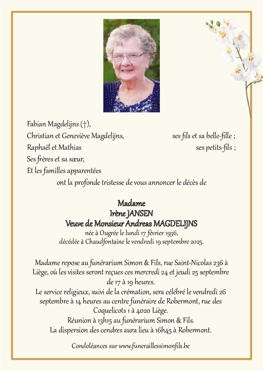 Décédée à Beaufays (4052) le vendredi 19 septembre 2025 à l'âge de 89 ans