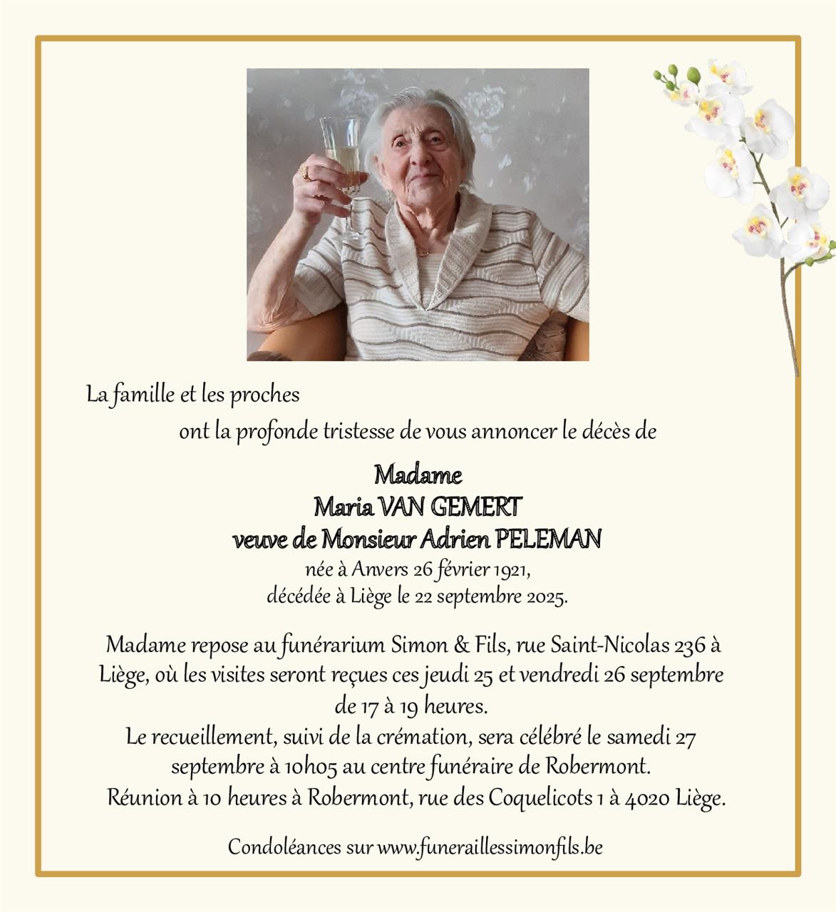 Décédée à Liège (4000) le lundi 22 septembre 2025 à l'âge de 104 ans