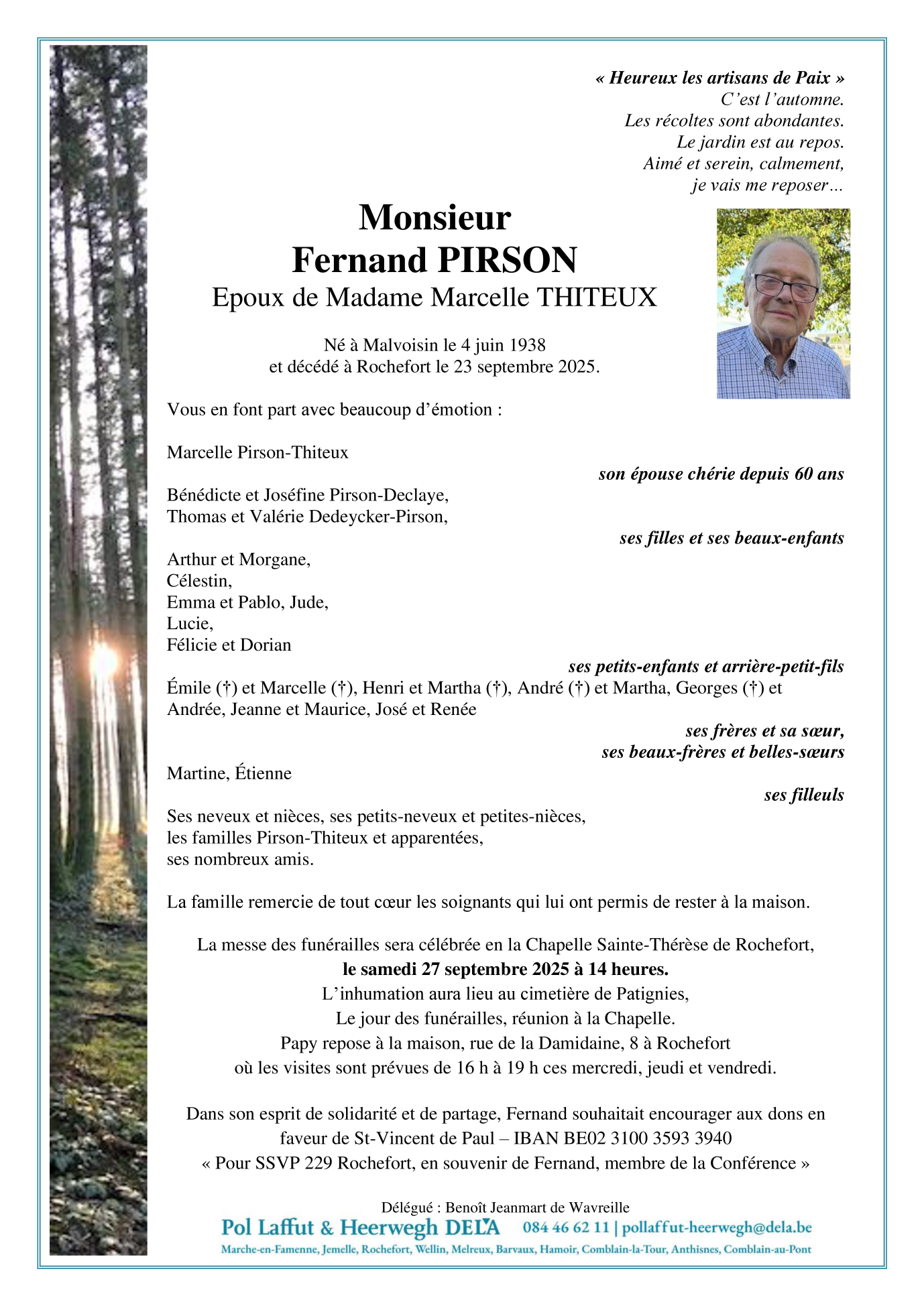 Décédé à Rochefort (5580) le mardi 23 septembre 2025 à l'âge de 87 ans