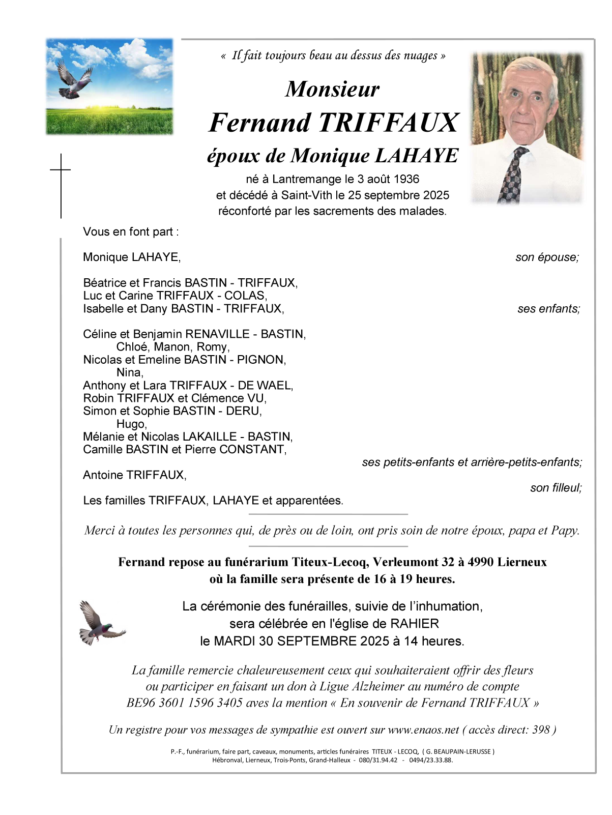 Décédé à Saint-Vith (4780) le jeudi 25 septembre 2025 à l'âge de 89 ans