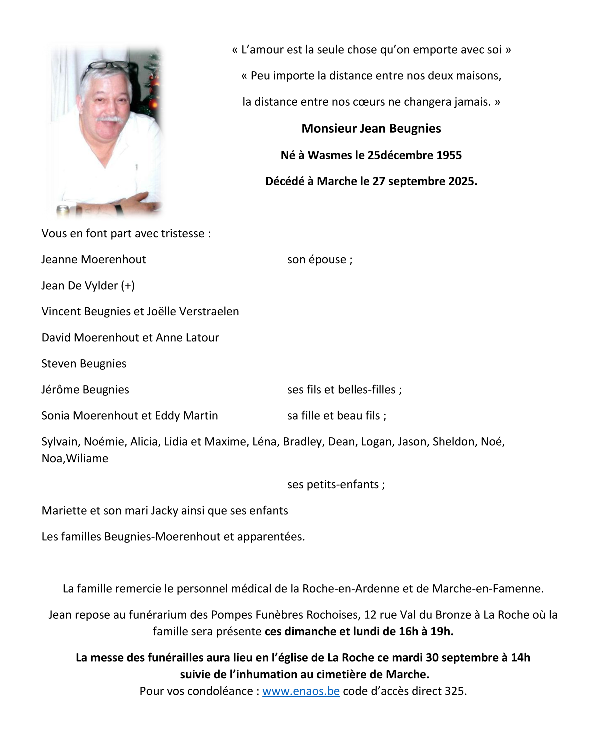 Décédé à Marche-en-Famenne (6900) le samedi 27 septembre 2025 à l'âge de 69 ans