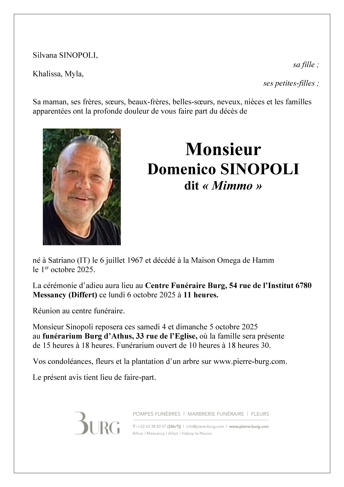 Décédé à Luxembourg/Hamm  (1713, Luxembourg) le mercredi 1 octobre 2025 à l'âge de 58 ans