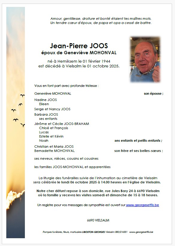 Décédé à Vielsalm (6690) le mercredi 1 octobre 2025 à l'âge de 81 ans