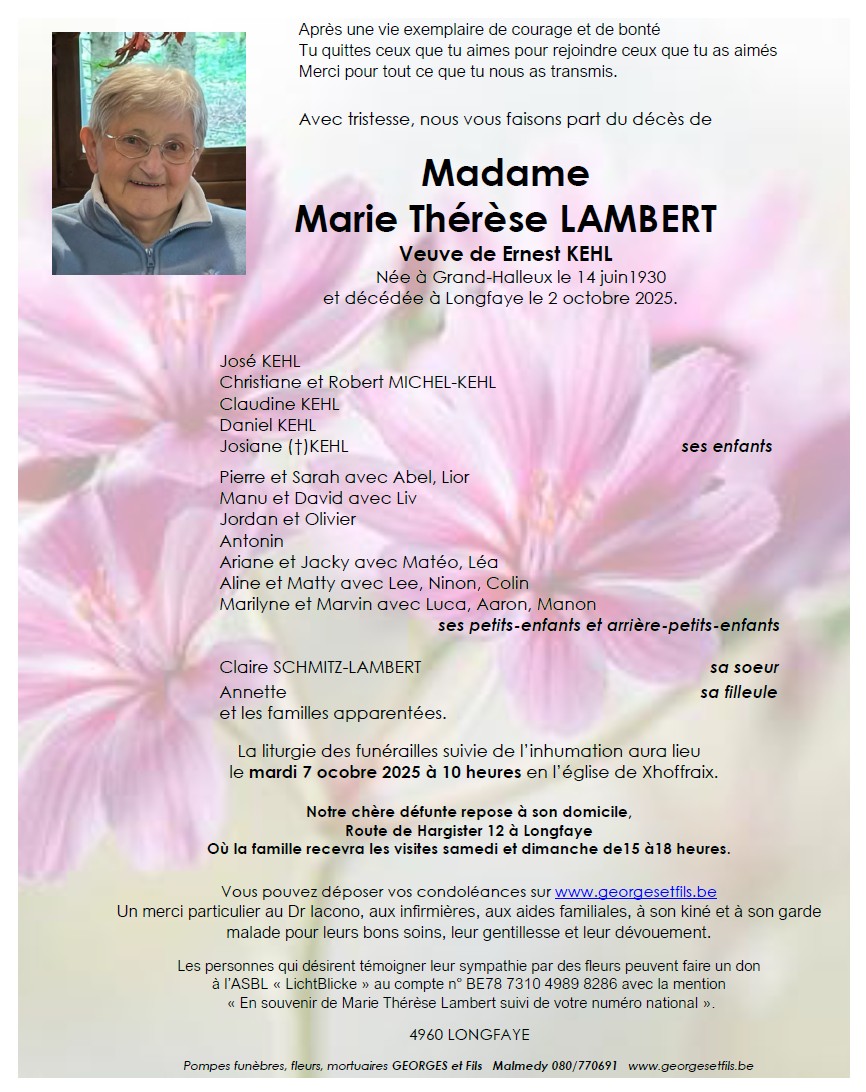 Décédée à Longfaye (4960) le jeudi 2 octobre 2025 à l'âge de 95 ans