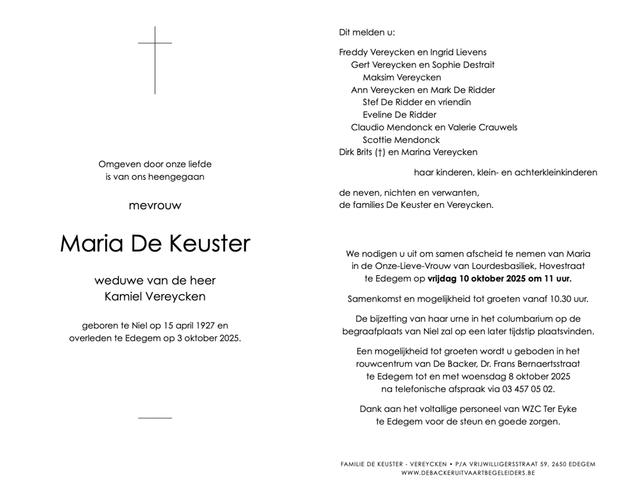 Décédée à Edegem (2650) le vendredi 3 octobre 2025 à l'âge de 98 ans