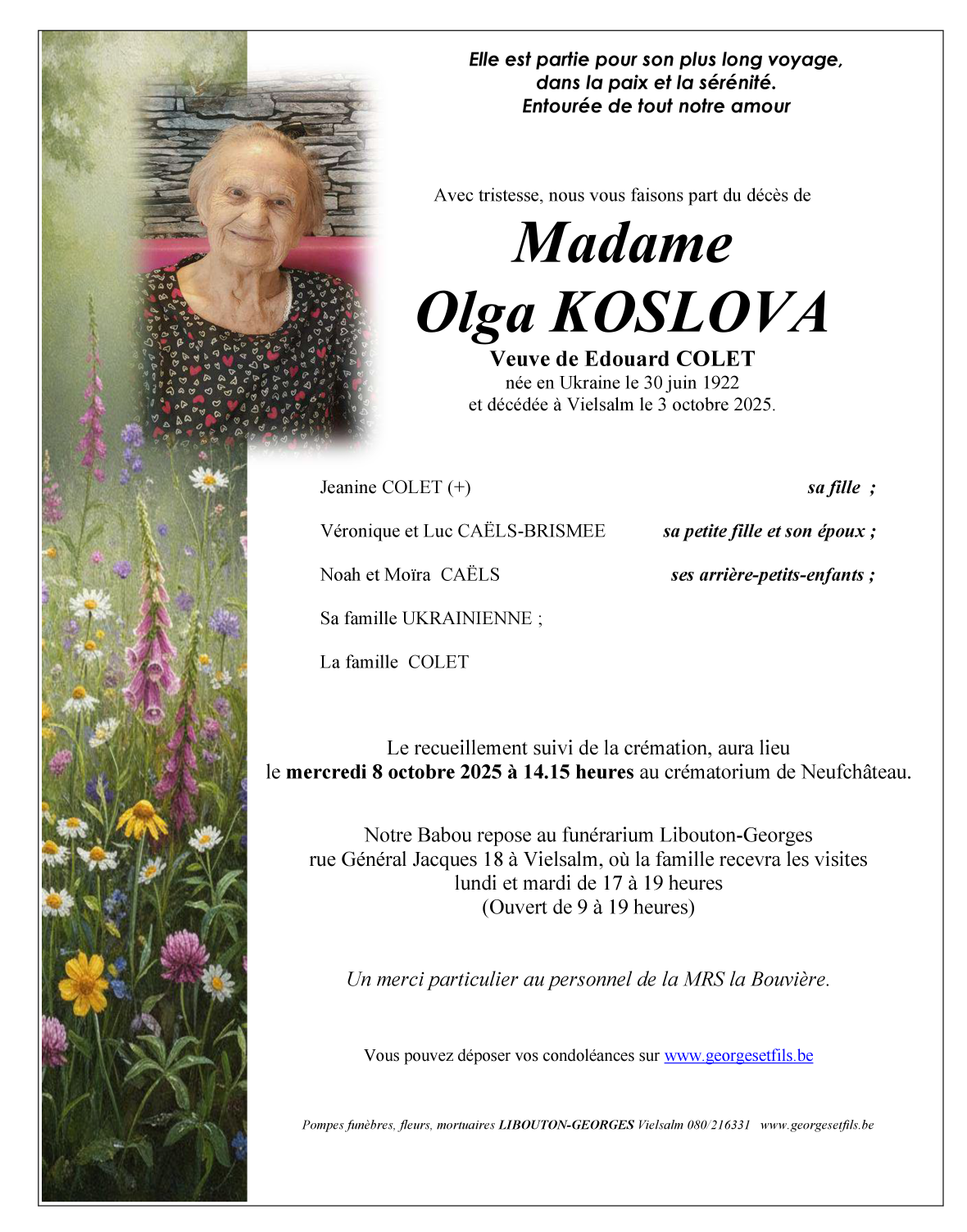 Décédée à Vielsalm (6690) le vendredi 3 octobre 2025 à l'âge de 103 ans