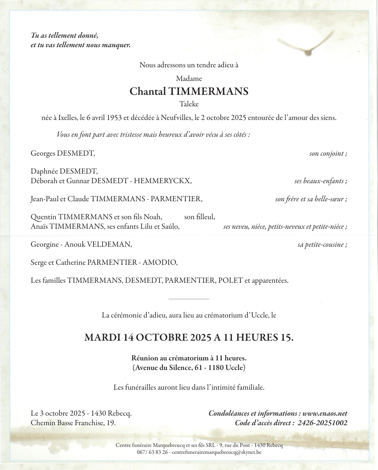 Décédée à Neufvilles (7063) le jeudi 2 octobre 2025 à l'âge de 72 ans