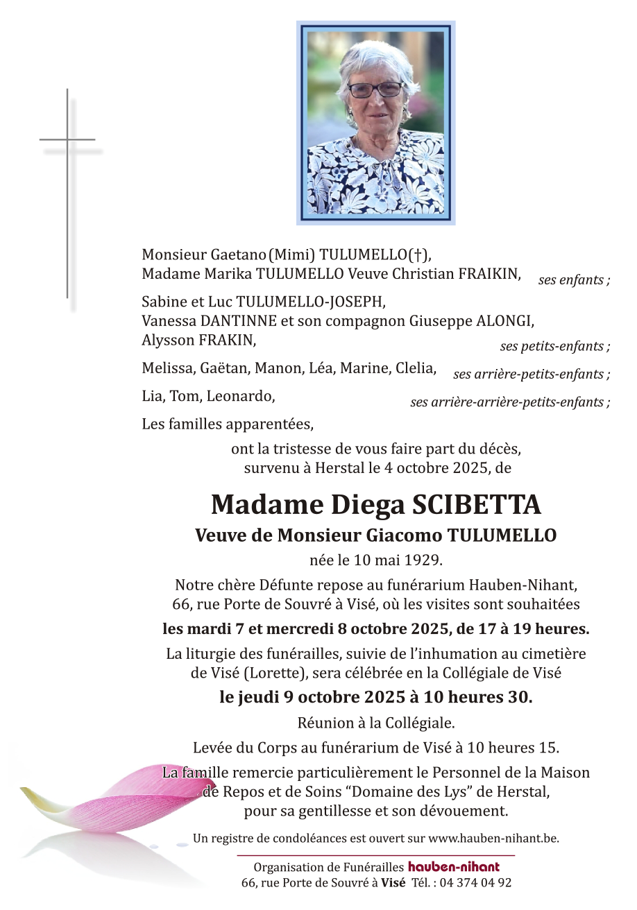 Décédée à Vottem (4041) le samedi 4 octobre 2025 à l'âge de 96 ans