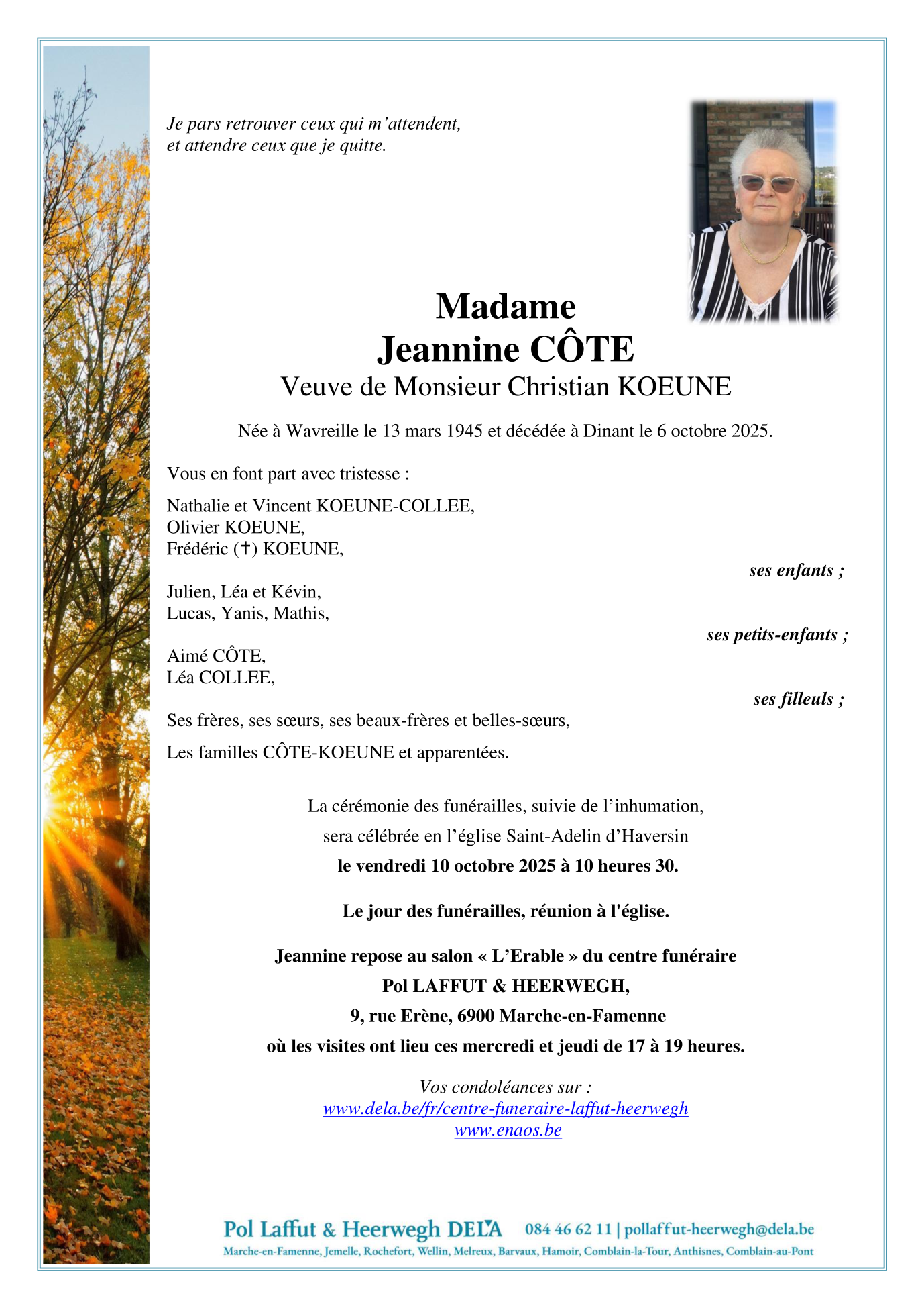 Décédée à Dinant (5500) le lundi 6 octobre 2025 à l'âge de 80 ans