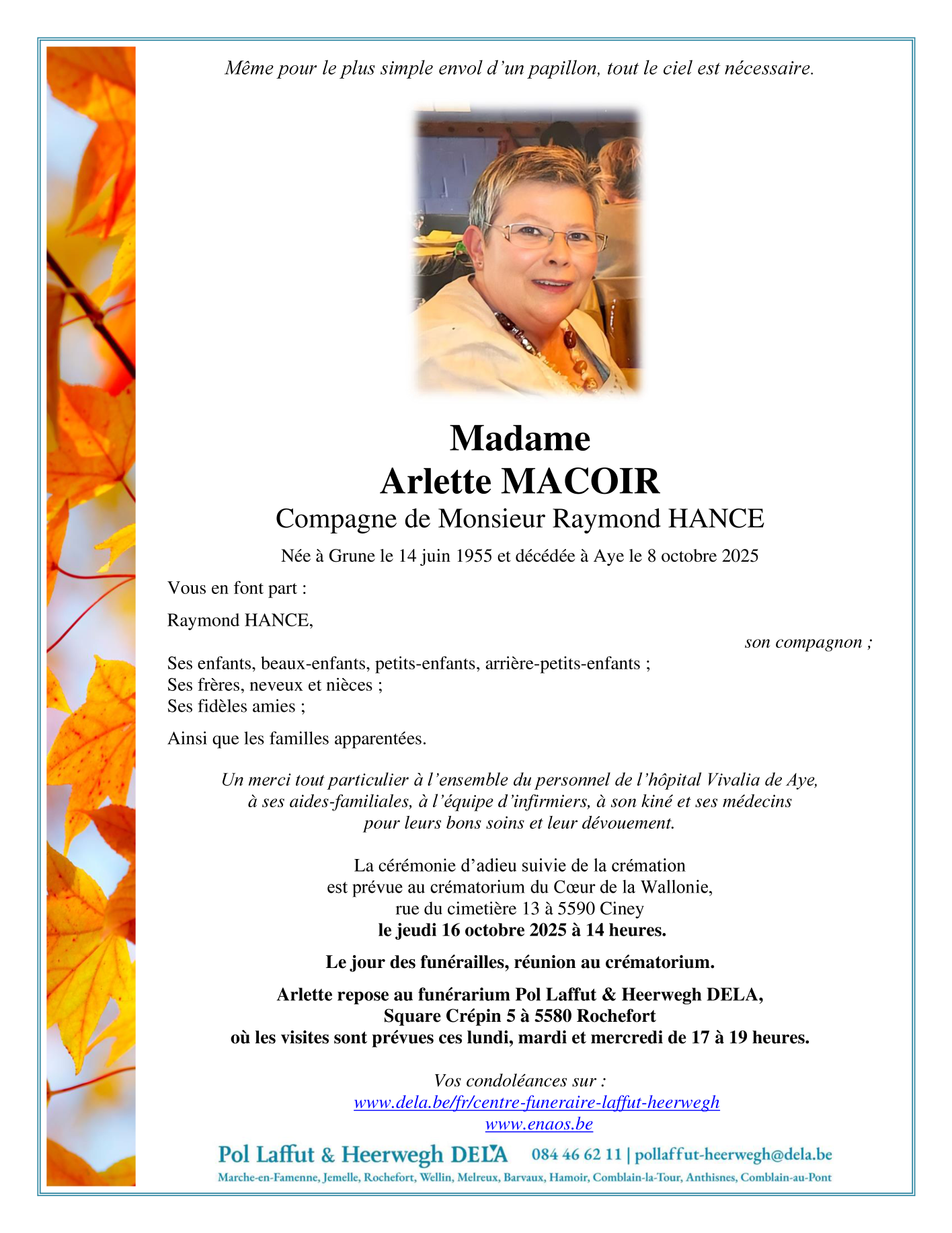 Décédée à Aye (6900) le mercredi 8 octobre 2025 à l'âge de 70 ans