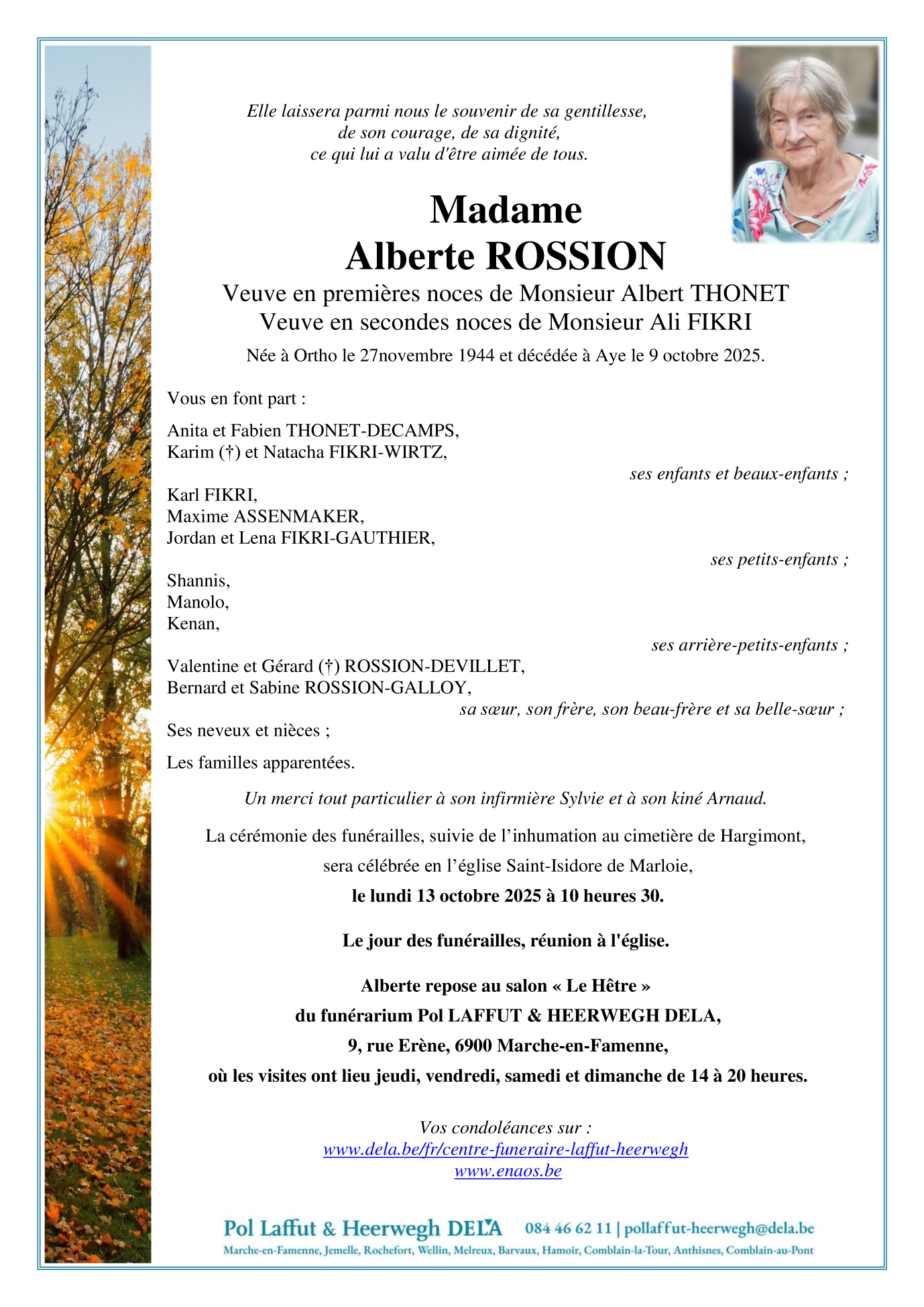 Décédée à Aye (6900) le jeudi 9 octobre 2025 à l'âge de 80 ans