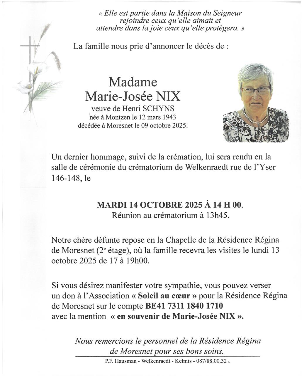 Décédée à Moresnet (4850) le jeudi 9 octobre 2025 à l'âge de 82 ans
