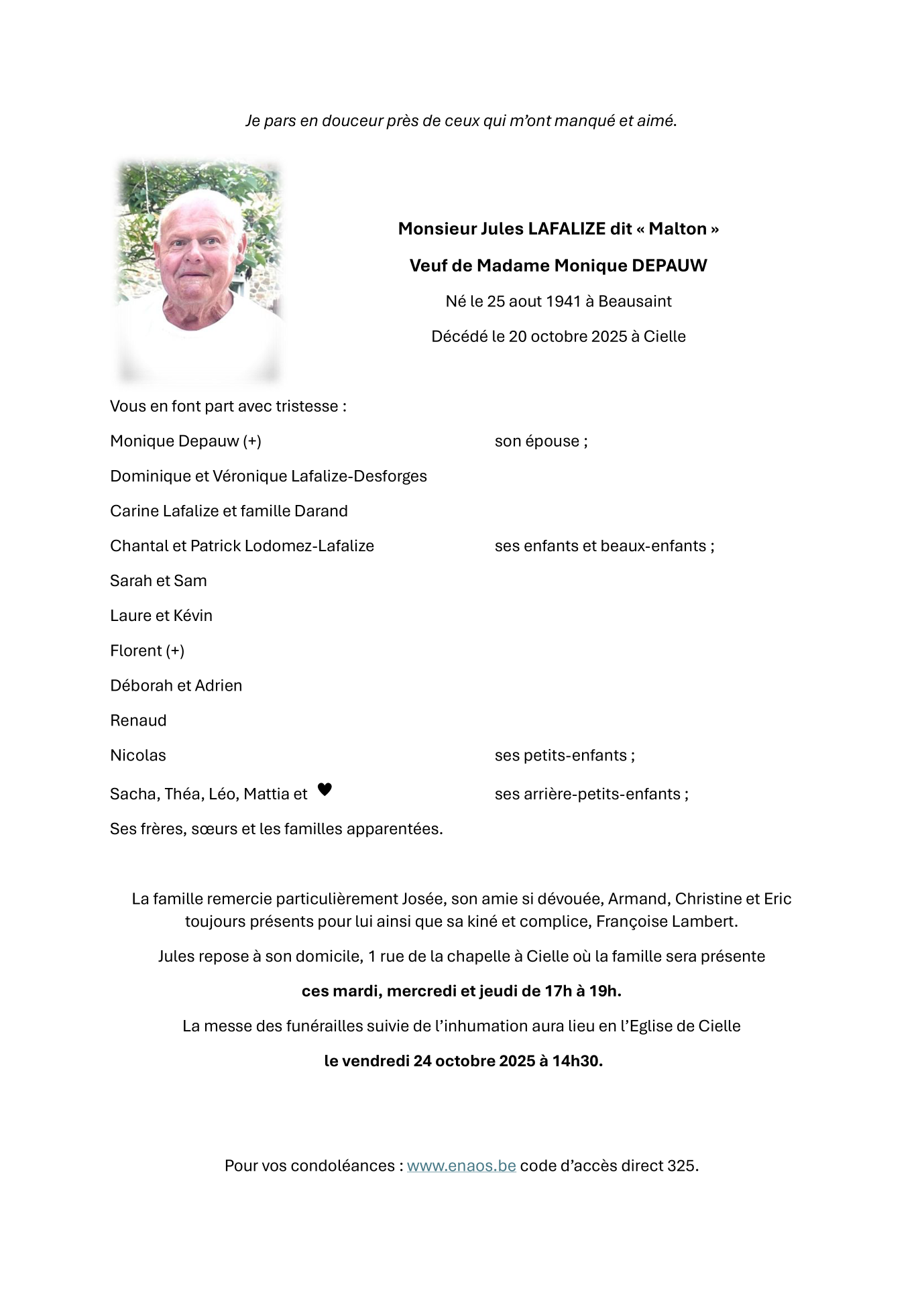Décédé à Cielle (6980) le lundi 20 octobre 2025 à l'âge de 84 ans