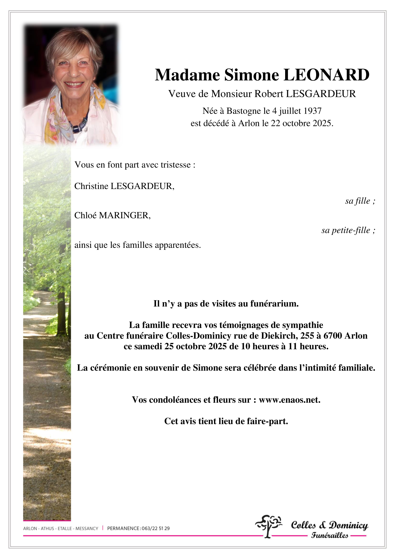 Décédée à Arlon (6700) le mercredi 22 octobre 2025 à l'âge de 88 ans