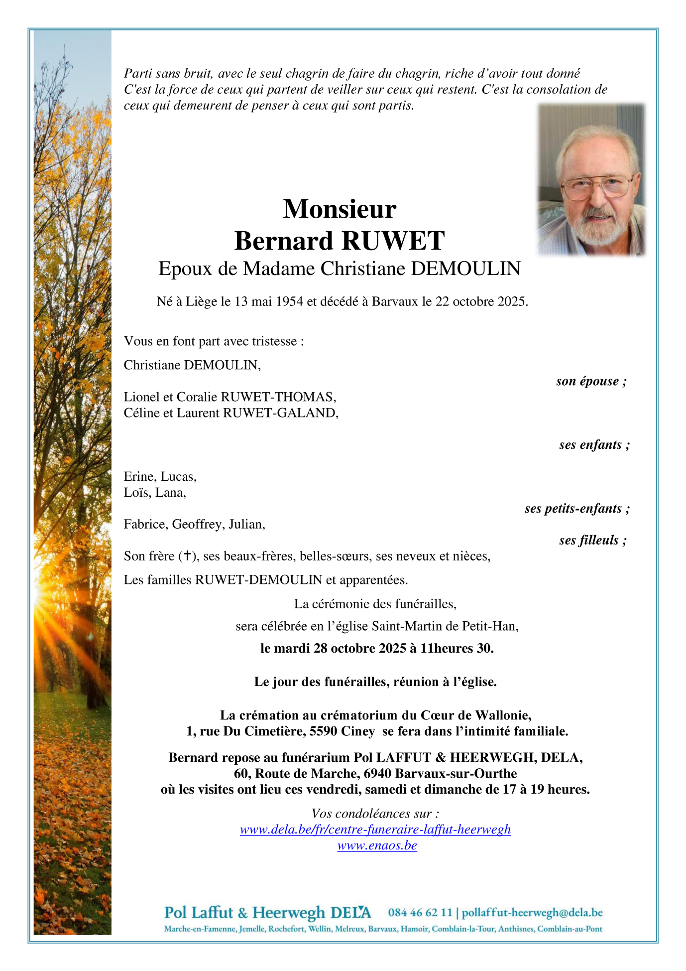 Décédé à Barvaux-sur-Ourthe (6940) le mercredi 22 octobre 2025 à l'âge de 71 ans