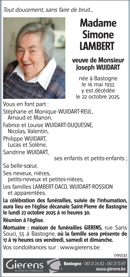 Décédée à Bastogne (6600) le mercredi 22 octobre 2025 à l'âge de 88 ans