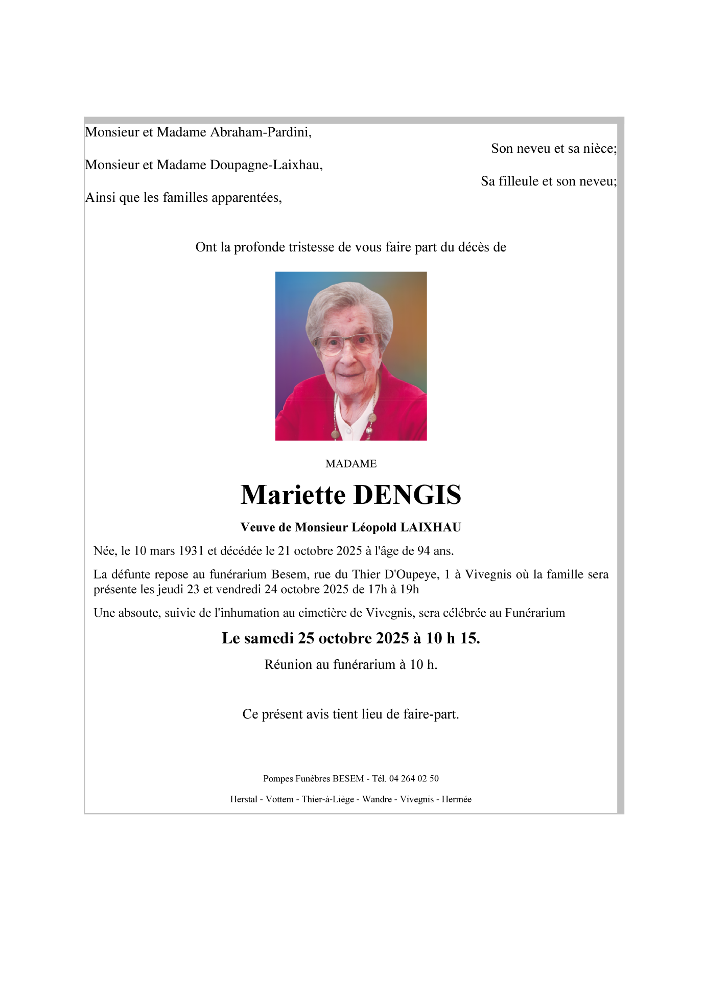 Décédée à Wonck (4690) le mardi 21 octobre 2025 à l'âge de 94 ans