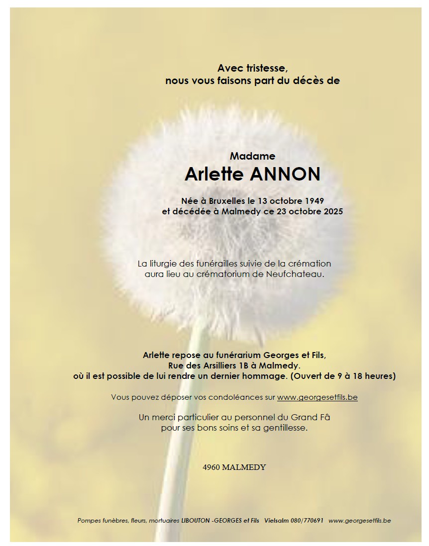 Décédée à Malmedy (4960) le jeudi 23 octobre 2025 à l'âge de 76 ans