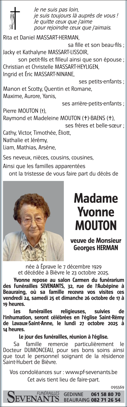Décédée à Bievre (5555) le jeudi 23 octobre 2025 à l'âge de 95 ans