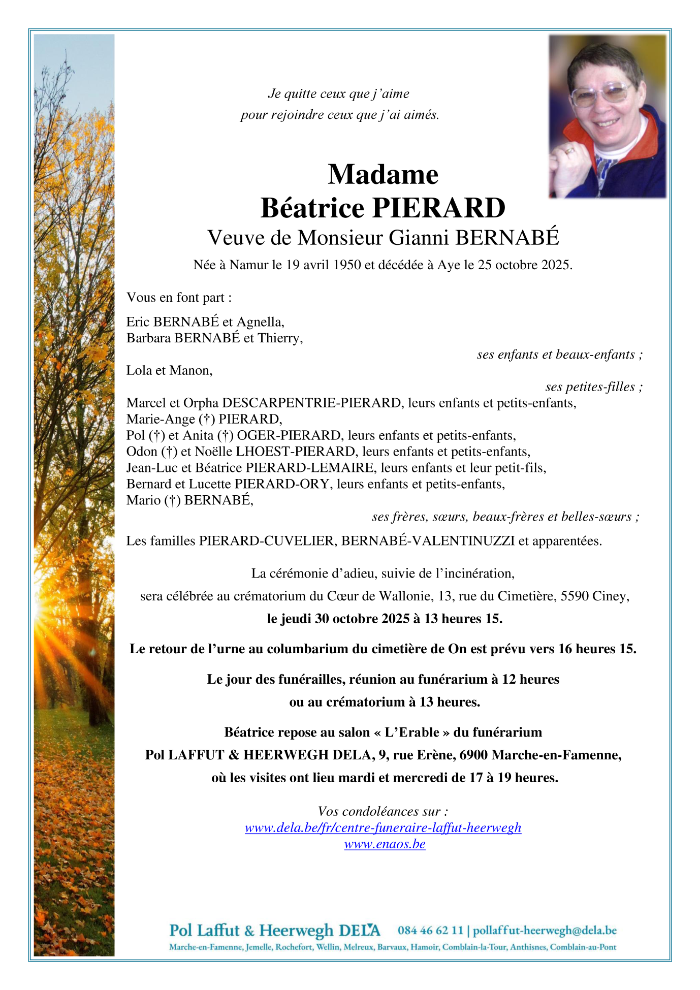 Décédée à Aye (6900) le samedi 25 octobre 2025 à l'âge de 75 ans