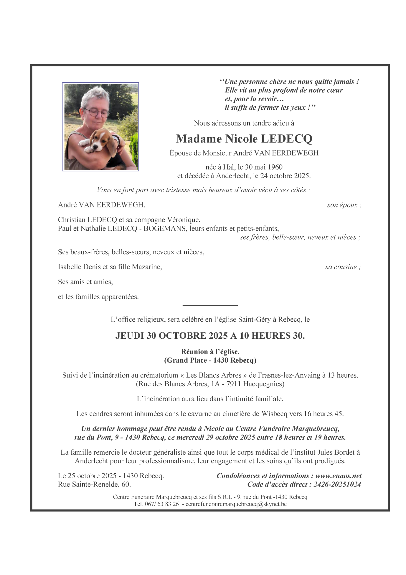 Overleden te Anderlecht (1070) op vrijdag 24 oktober 2025 op 65-jarige leeftijd