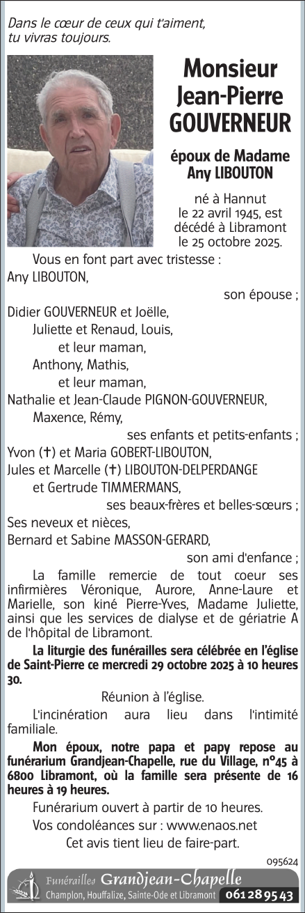 Décédé à Libramont (6800) le samedi 25 octobre 2025 à l'âge de 80 ans