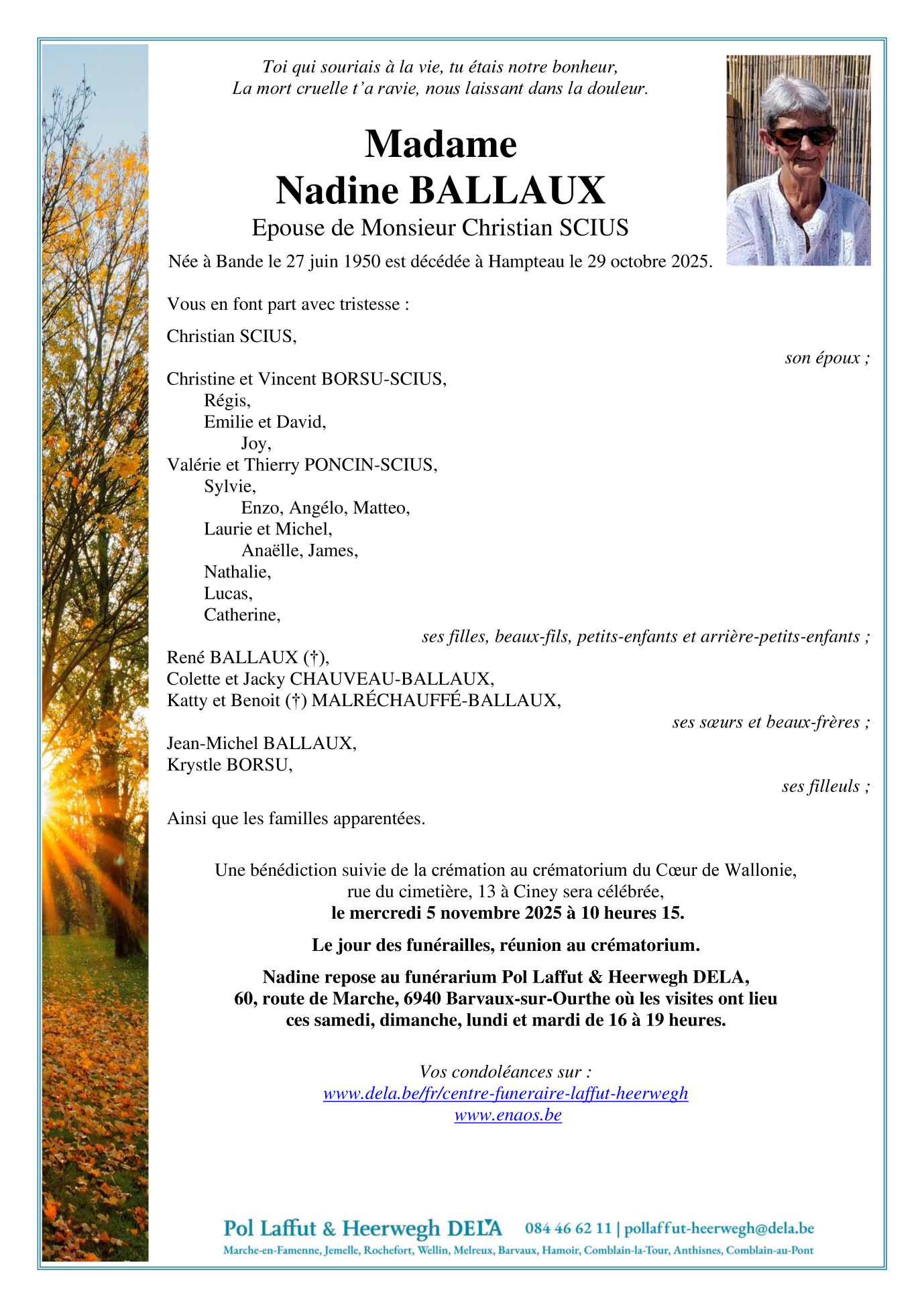 Décédée à Hampteau (6990) le mercredi 29 octobre 2025 à l'âge de 75 ans