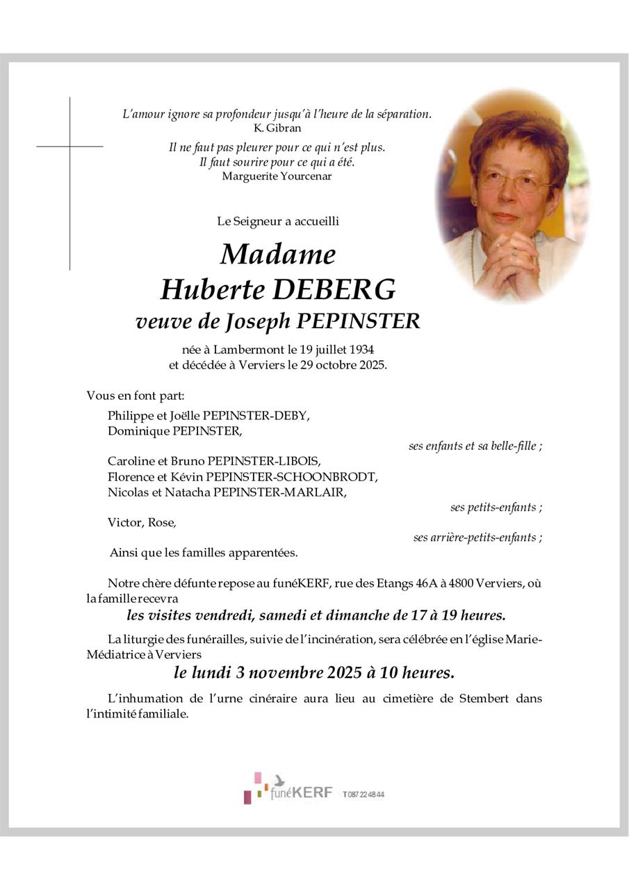 Décédée à Verviers (4800) le mercredi 29 octobre 2025 à l'âge de 91 ans