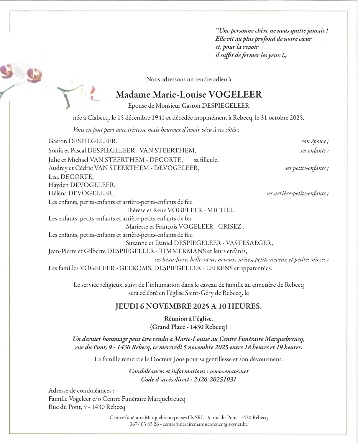 Décédée à Rebecq (1430) le vendredi 31 octobre 2025 à l'âge de 83 ans