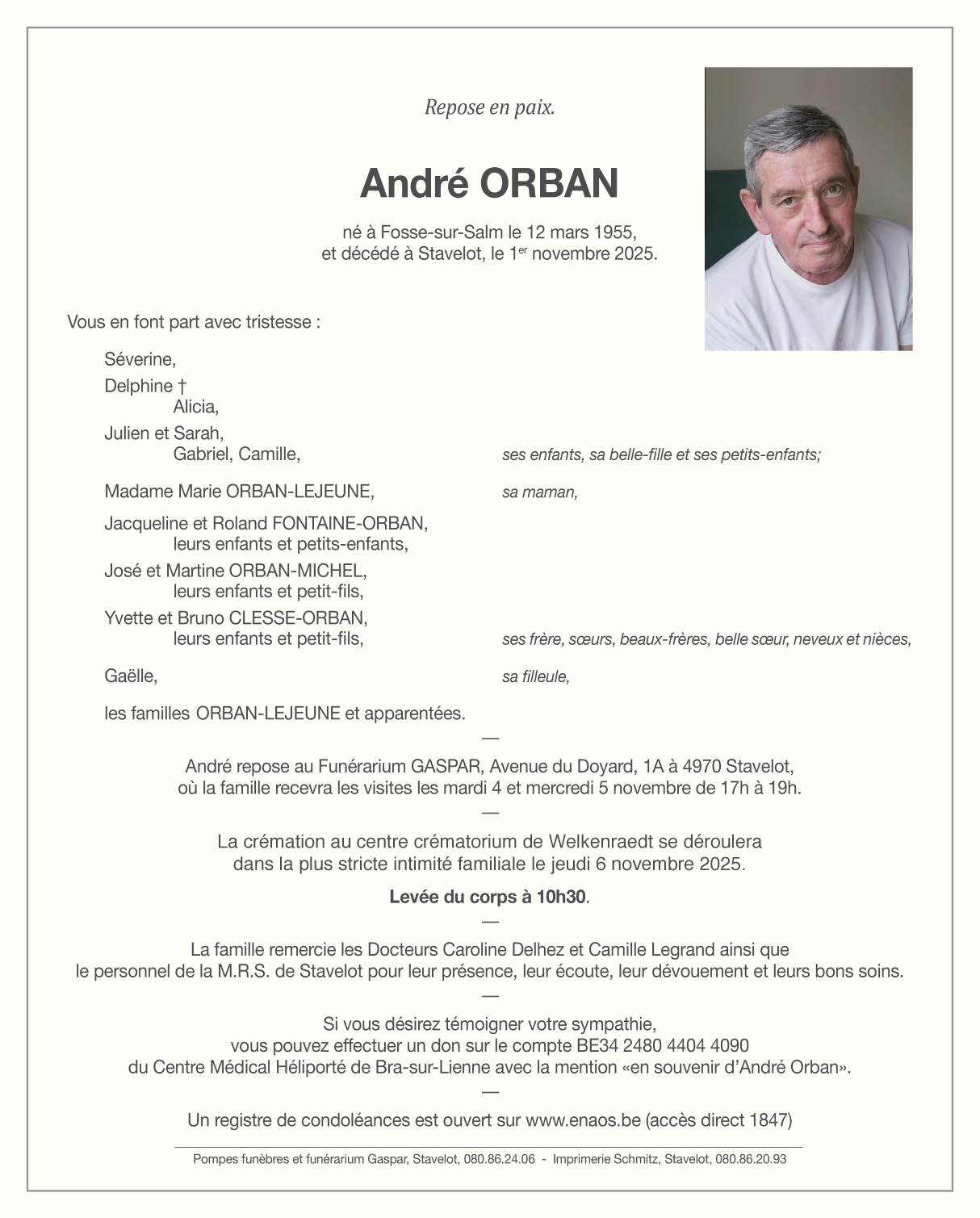 Décédé à Stavelot (4970) le samedi 1 novembre 2025 à l'âge de 70 ans