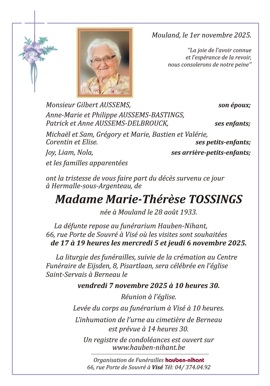 Décédée à Hermalle-sous-Argenteau (4681) le samedi 1 novembre 2025 à l'âge de 92 ans