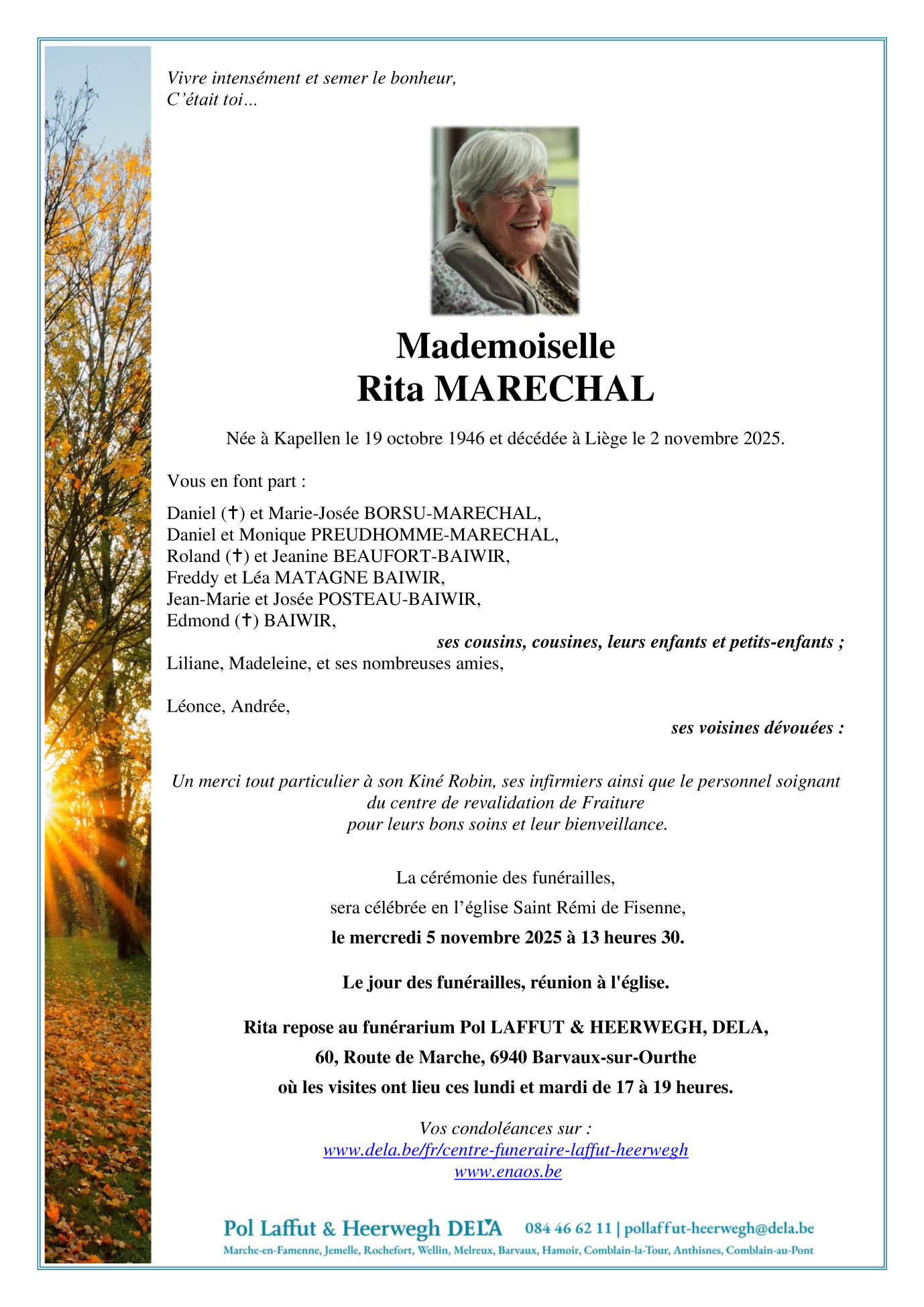 Décédée à Liège (4000) le dimanche 2 novembre 2025 à l'âge de 79 ans