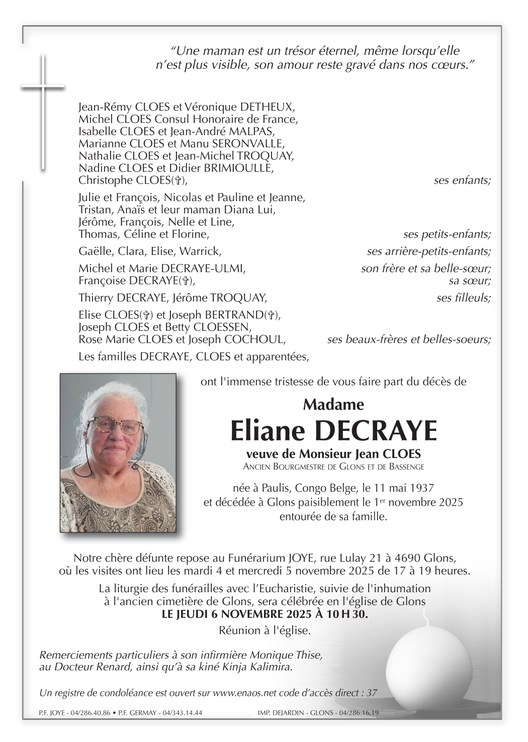 Décédée à Glons (4690) le samedi 1 novembre 2025 à l'âge de 88 ans