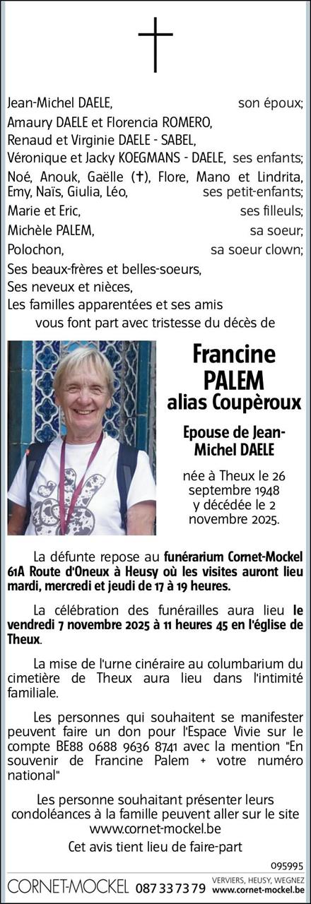 Décédée à Theux (4910) le dimanche 2 novembre 2025 à l'âge de 77 ans